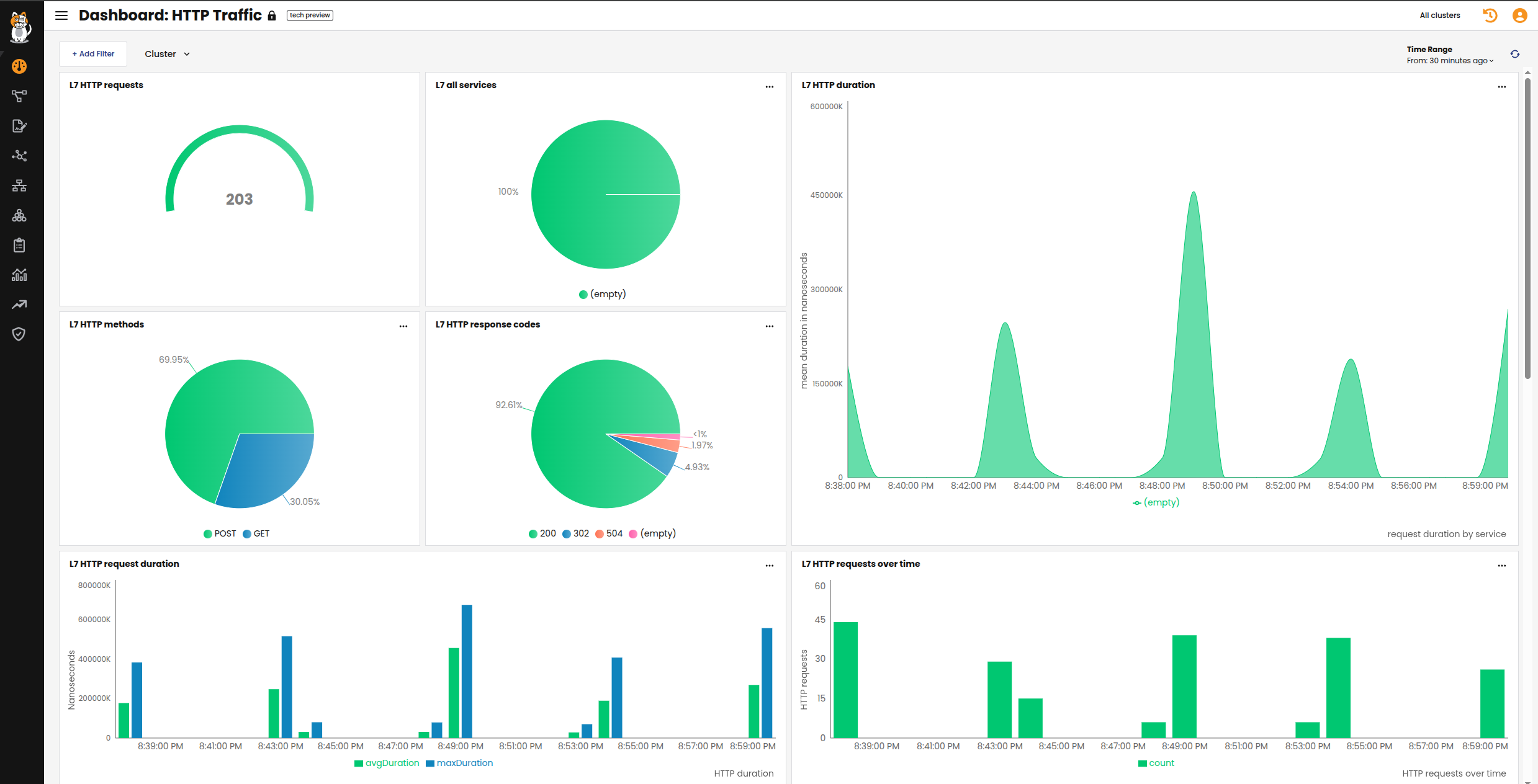 The HTTP Traffic dashboard provides application performance metrics for inscope Kubernetes services. The data can assist service owners and platform personnel in assessing the health of cluster workloads without the need for a full service mesh. L7 logs are not enabled by default, and must be configured.